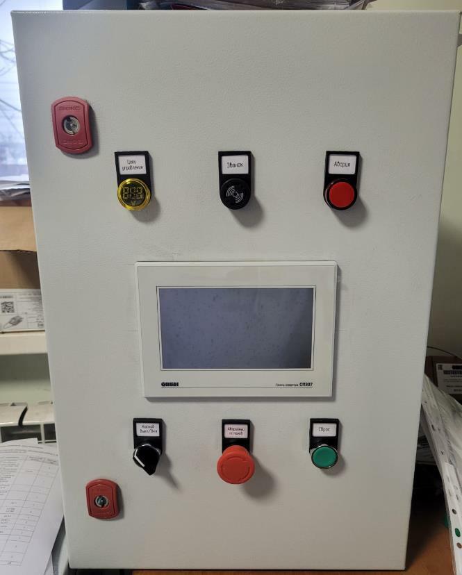 На монтажной панели внутри щита установлены автоматические выключатели, промежуточные реле и клеммные колодки, предназначенные для подключения датчиков, исполнительных механизмов, программируемый логический контроллер, модуль ввода аналоговых сигналов.