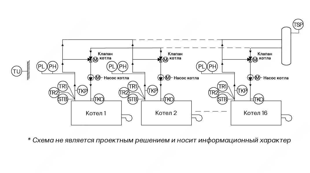 16 котлов, погодозависимое регулирование |